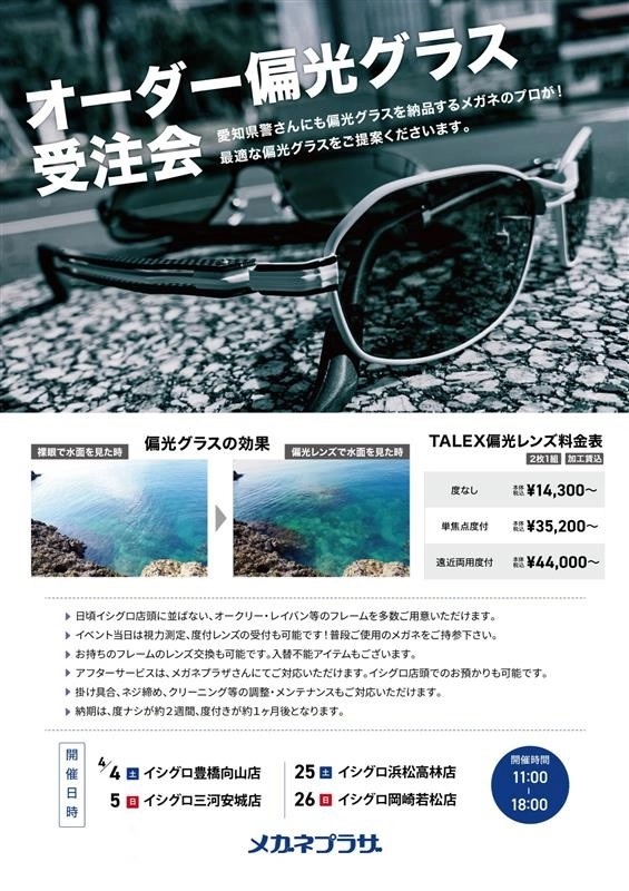 【4月イシグロ様各店舗でのサングラス受注会の日程】 2026年04月03日 4月の土日はイシグロ様の各店にお邪魔して 偏光レンズ受注会を開催します。 ぜひこの機会にご来店下さいませ ≪ 前の記事 ブログ一覧へ戻る